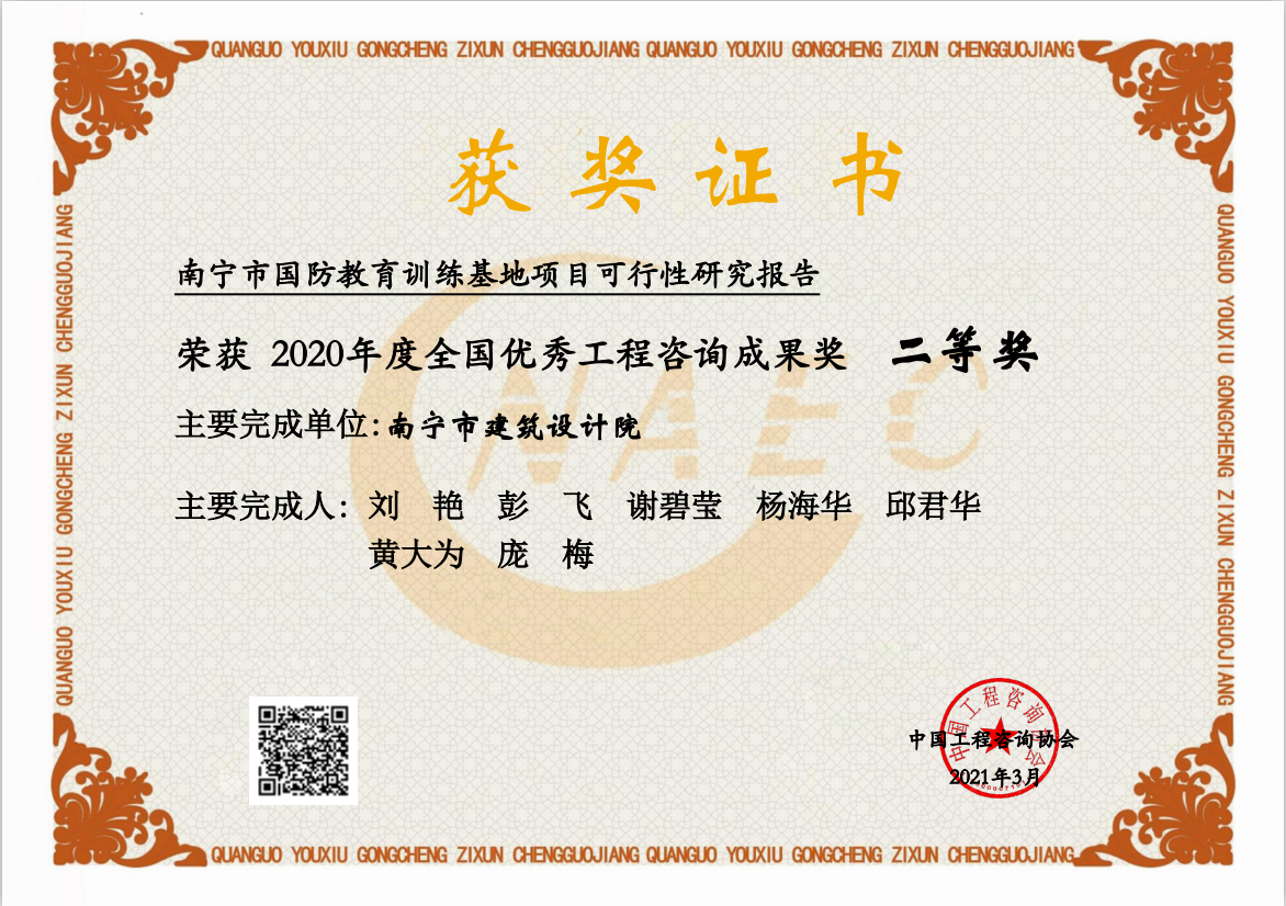 3月,中國工程咨詢協會發布了2020年度全國優秀工程咨詢成果獎,由我公司申報的《南寧市國防教育訓練基地項目可行性研究報告》獲得2020年度全國優秀工程咨詢成果獎二等獎。此前,該成果報告還獲得了2020年度廣西優秀工程咨詢成果一等等次。