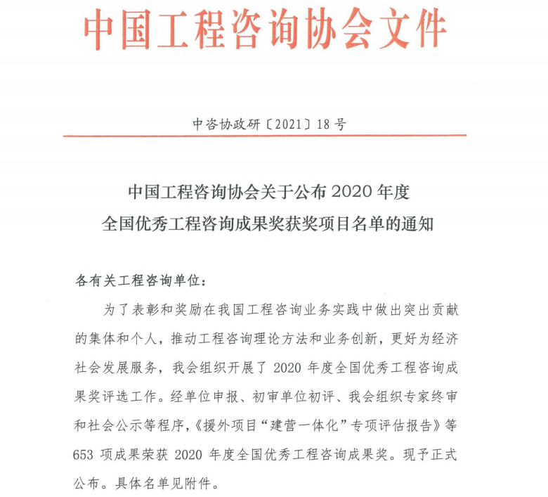 公司喜獲“2020年度全國優秀工程咨詢成果獎”