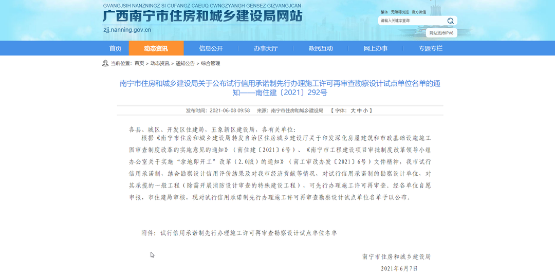 6月8日,南寧市住房和城鄉建設局發布《關于公布試行信用承諾制先行辦理施工許可再審查勘察設計試點單位名單的通知》(南住建〔2021〕292號)。