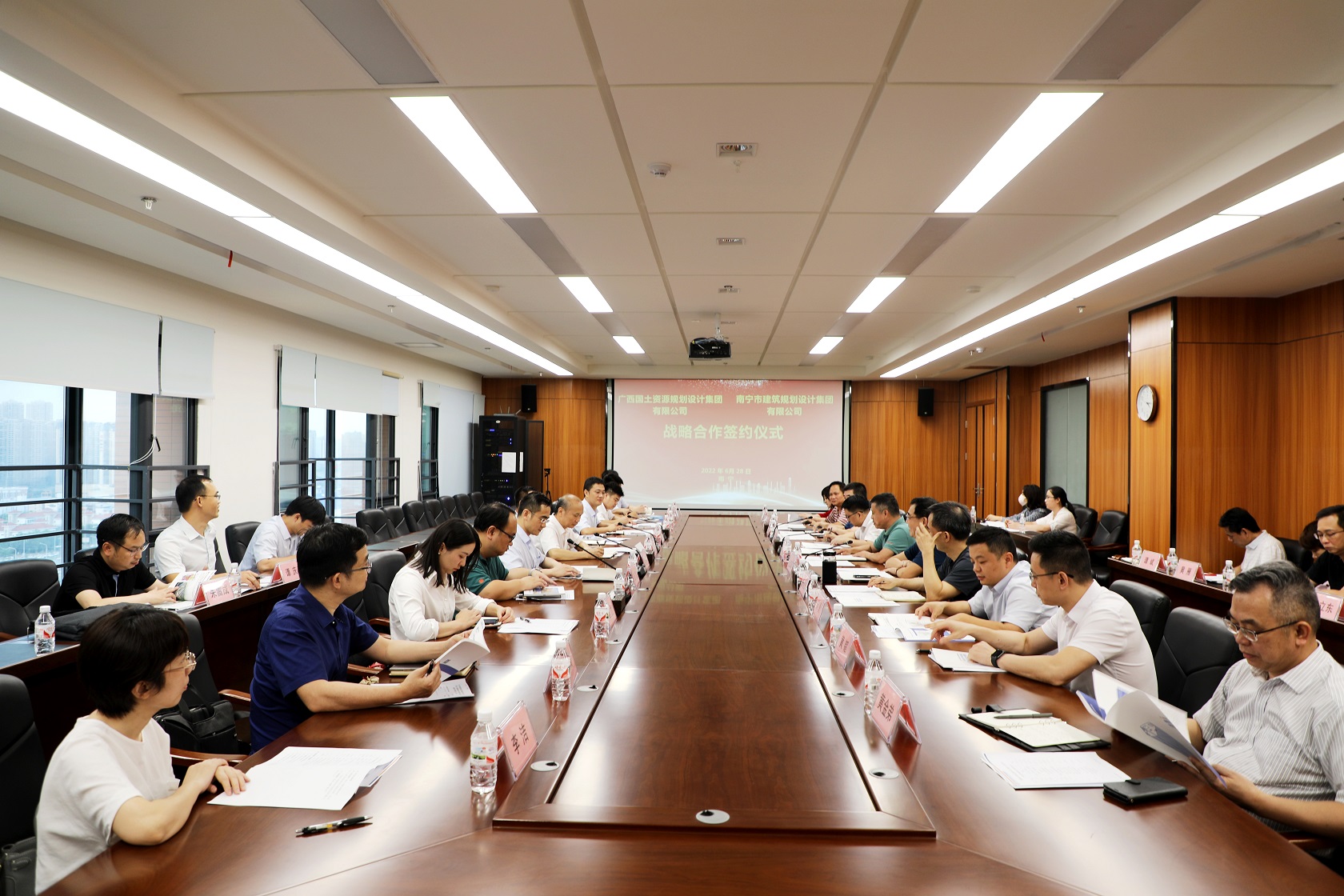 6月28日,南寧市建筑規劃設計集團有限公司與廣西國土資源規劃設計集團有限公司戰略合作簽約儀式在我集團舉行。集團黨委書記、董事長韋文學和廣西國土資源規劃設計集團黨委書記、董事長鄧強出席儀式并見證簽約,集團總經理、副董事長馮江泉和廣西國土資源規劃設計集團總經理、黨委副書記、副董事長魏玉平分別代表雙方簽訂戰略合作協議。
