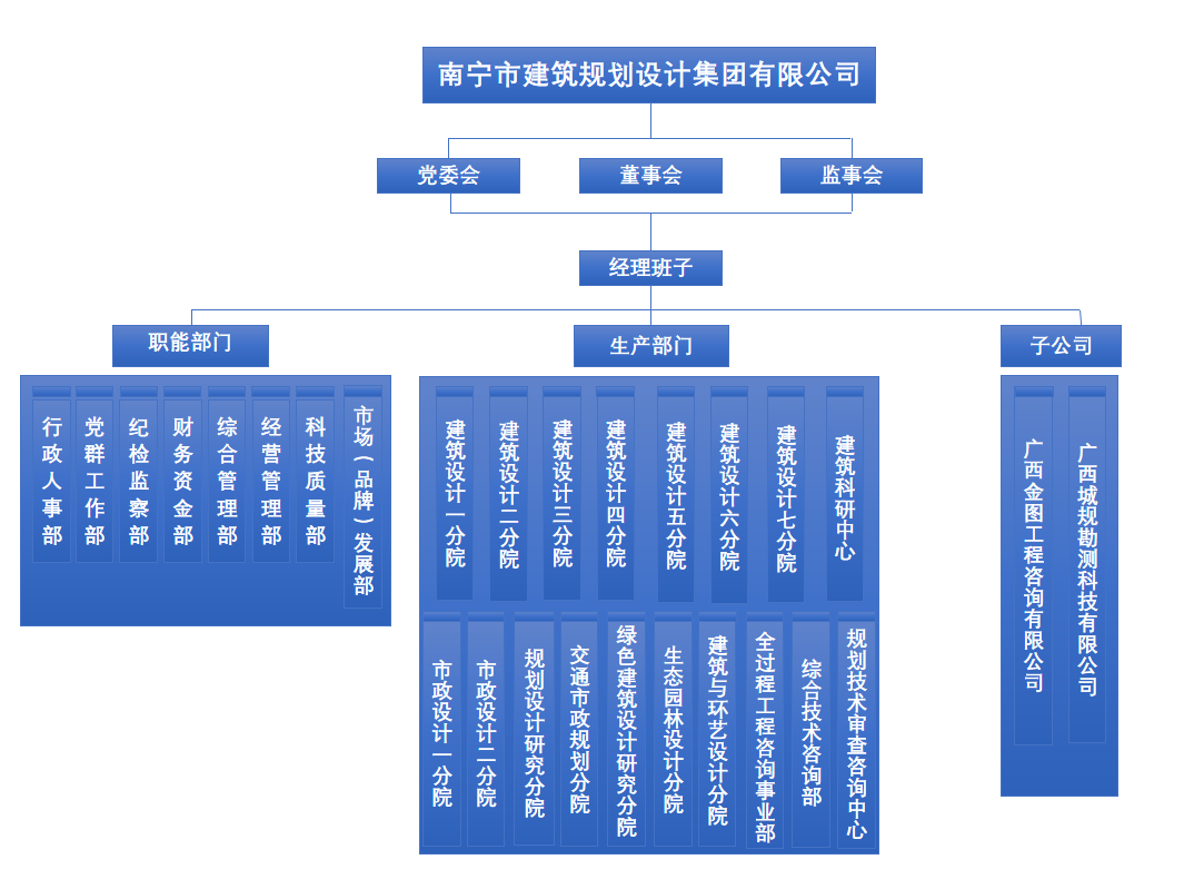 集團按照現代企業制度和法人治理結構要求,設有“三會一層”,即黨委會、董事會、監事會和經理層,內設8個職能部門和18個業務生產部門,下屬2個全資子公司,下轄15個黨支部。